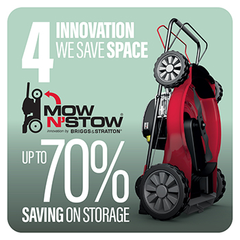 innebär att gräsklipparen kan förvaras vertikalt, vilket minskar den nödvändiga förvaringsytan med upp till 70 % och underlättar det för dig att rengöra klipparens undersida och serva bladet. Mow N’Stow-motortekniken har en förgasare som inte läcker, en unik bränsletanksdesign med nya tätningar, packningar och o-ringar och ett högt oljepåfyllningsrör som gör att gräsklipparen kan lagras vertikalt. Med ett snabbkopplingshandtag, avancerad motorkonstruktion och enastående åtkomst till bladen för en perfekt rengöring, är Mow N’Stow en revolution inom gräsklippardesign. Den passar de trånga utrymmena i skjulet eller garaget, vilket ger dig mer plats åt din favorit fritids- eller sportutrustning. Ge utrymme för fritiden!